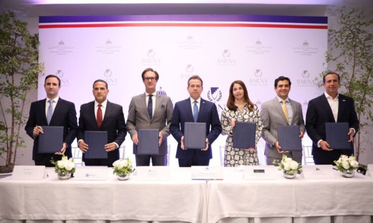 El compromiso con Barna Management School fue rubricado por el ministro de Industria, Comercio y Mipymes (MICM) Víctor Ito Bisonó, Paulo Álvarez, Rector de Barna, Cristopher Paniagua, Presidente Ejecutivo del Banco Popular, Anyarlene Bergés, Vicepresidenta de Relaciones Institucionales, Comunicaciones y Sostenibilidad de INICIA, Ra 163l Hoyo, director general de GAM Capital, Eduardo Brugal, Representante Empresas León Jiménes S.R.L. y Luis Manuel Pellerano, Presidente de la Asociación Nacional de Jóvenes Empresarios (ANJE).